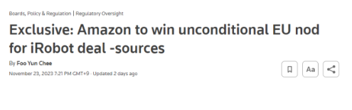 24일 로이터통신은 EU가 아마존의 아이로봇 인수를 승인할 것이라고 보도했습니다.