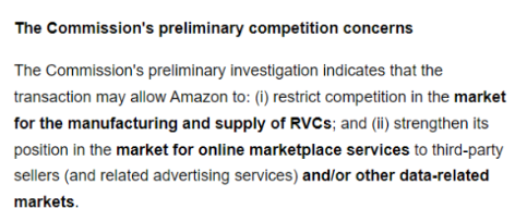 EU 집행위가 아마존의 아이로봇인수를 반대하는 이유는 크게 두가지입니다.