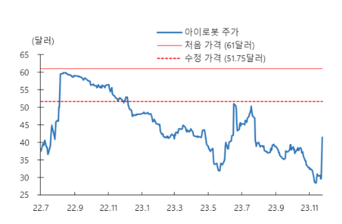 아마존이 처음 아이로봇 인수 의사를 발표한것은 2022년 8월이었습니다. 발표 이후 아이로봇 주가는 아마존시 제시한 인수가격인 61달러에 근접한 수준까지 한번에 상승했습니다.