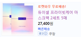 * 쿠팡에서 듀이셀 프라이빗 케어 마스크팩 5매, 2세트 -> 27,400원에 판매중